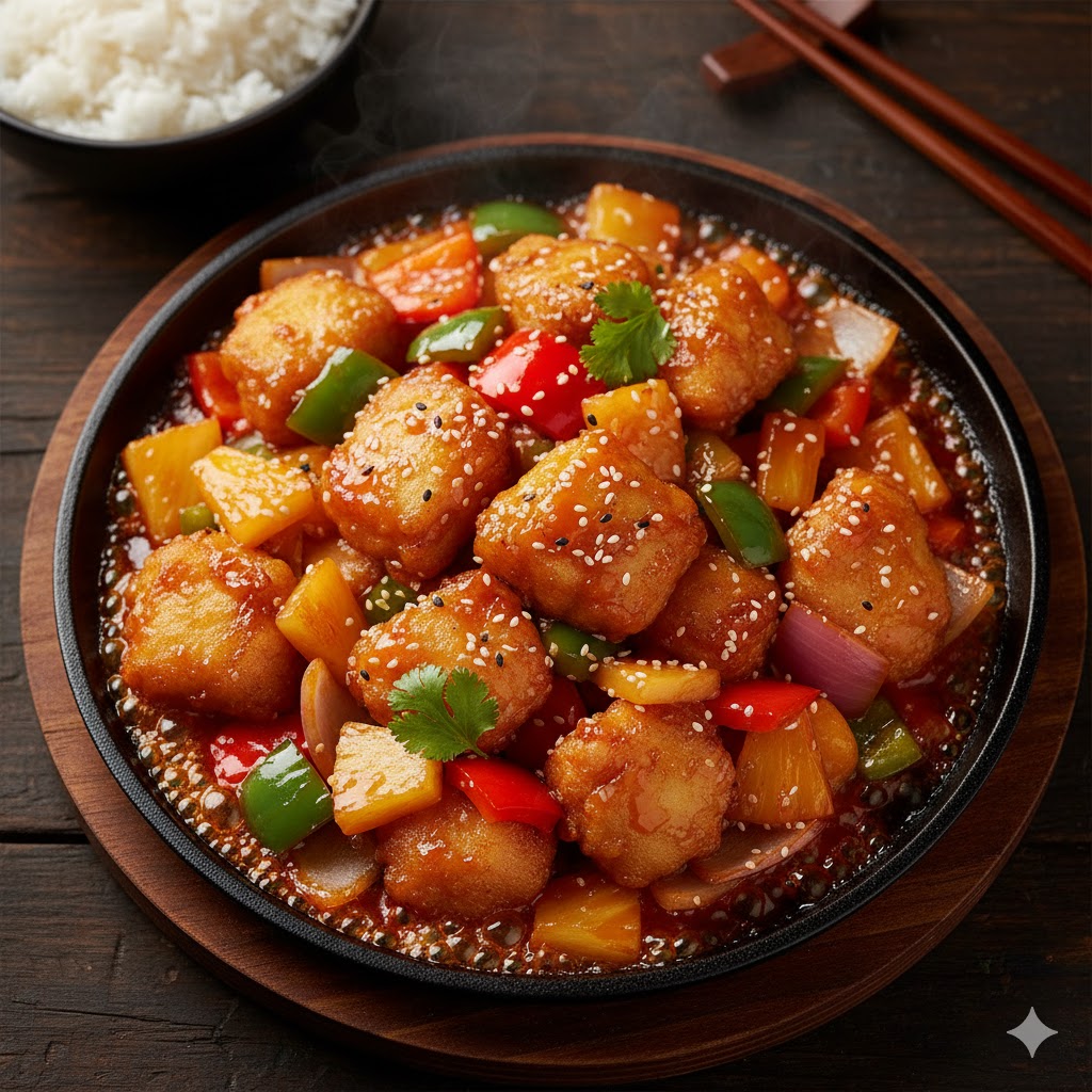 Fried fish fillets coated in a bright, tangy-sweet sauce.