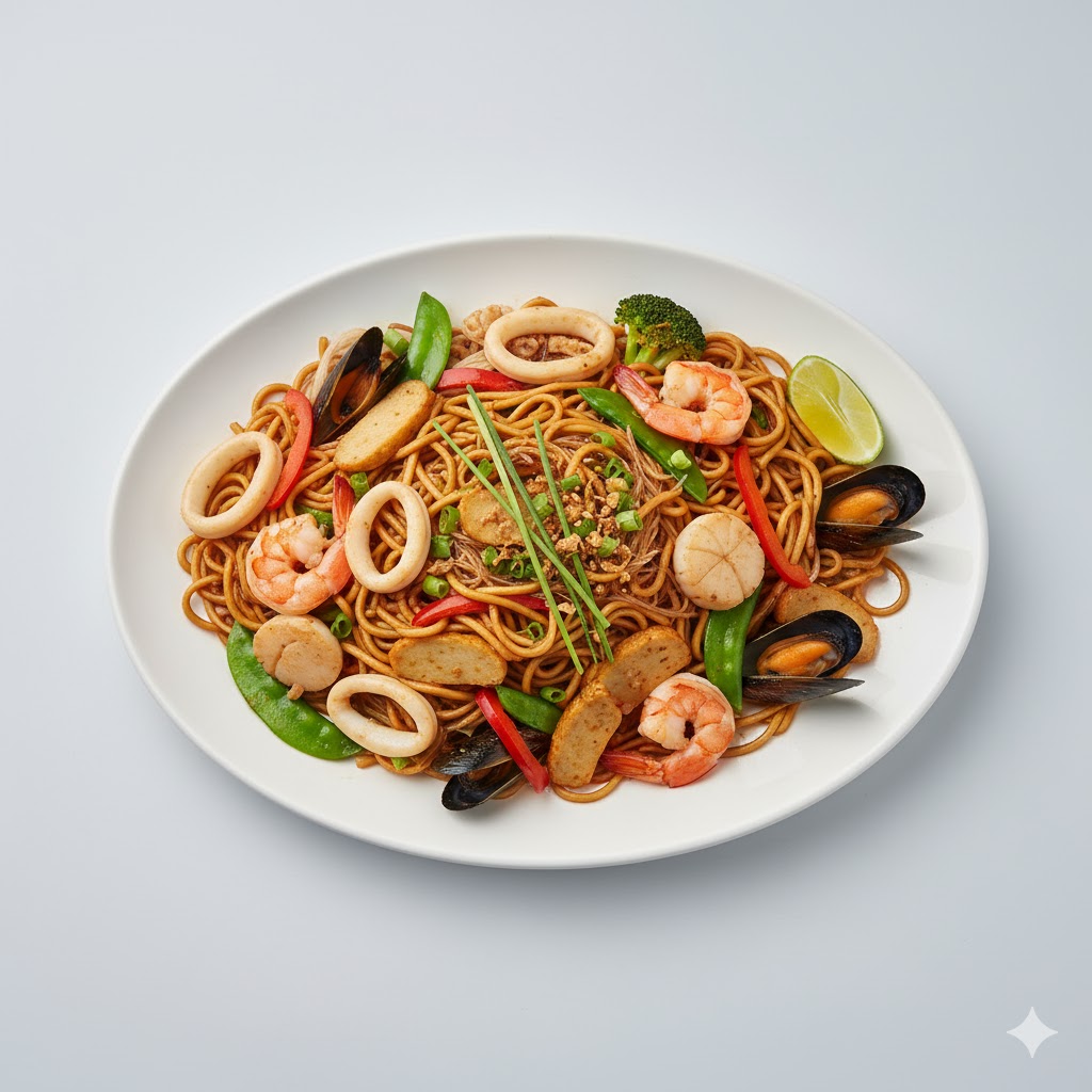 Stir-fried noodles featuring a mix of various seafood ingredients.