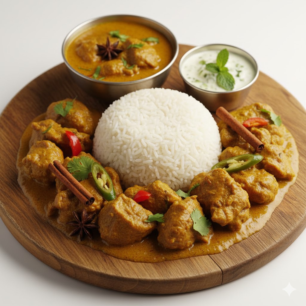Chicken pieces cooked in a fragrant curry sauce, served over rice.