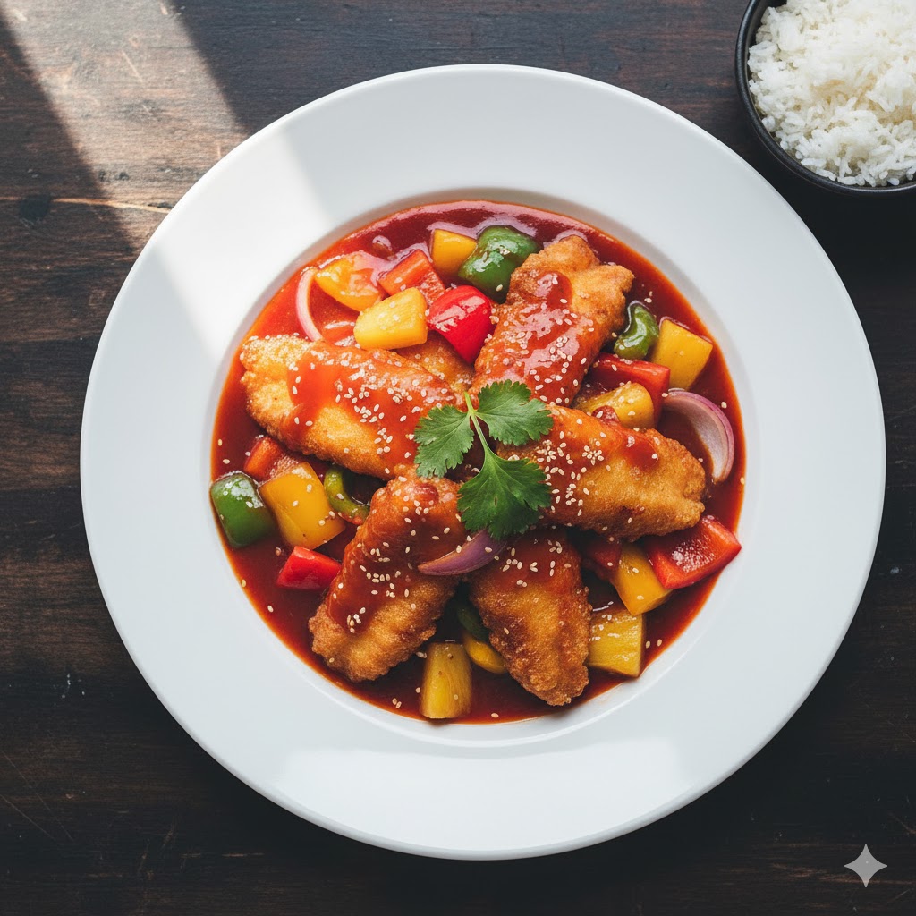 Fried fish fillets coated in a bright, tangy-sweet sauce.