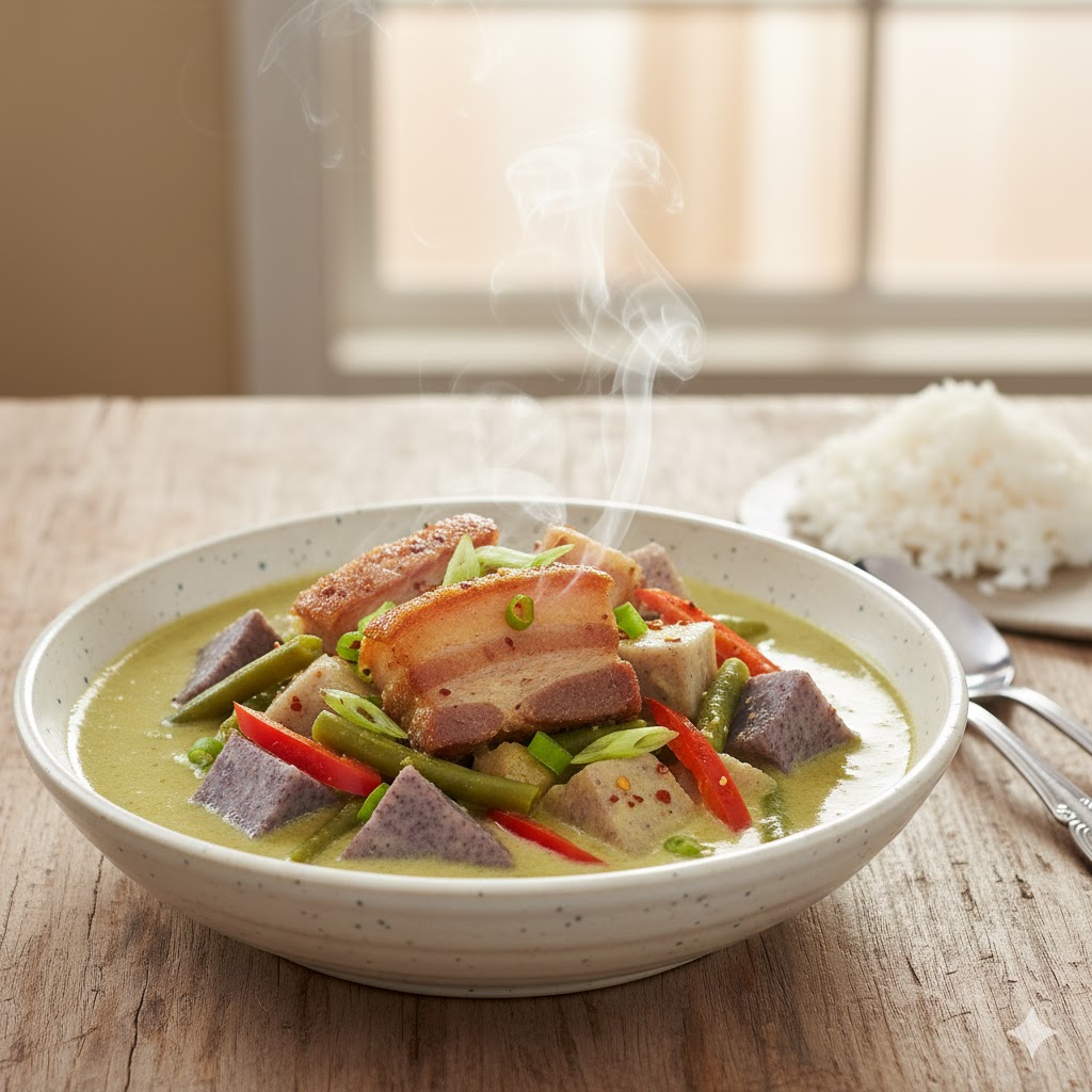 A savory stir-fry dish featuring taro root (Gabi).