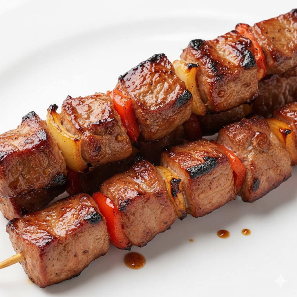 Skewers of pork slices marinated in a sweet and tangy sauce, then grilled.
