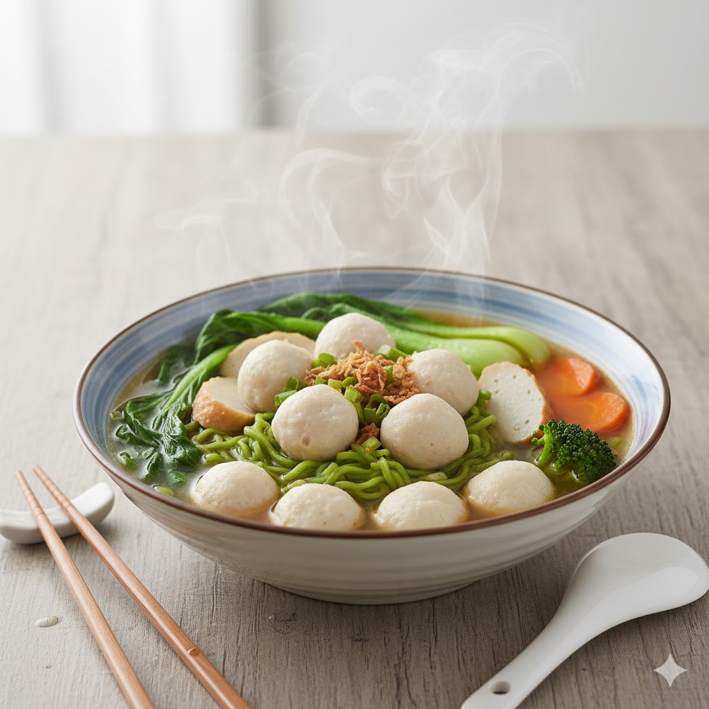 Clear broth with springy fish balls and crisp vegetables.